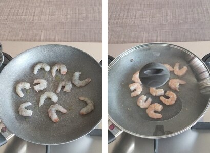– Saltear las gambas en la sartén con una cucharada de aceite un par de minutos por lado (cubriendo con tapa después de darles la vuelta) y reservar.