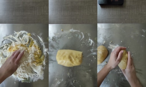 – Formar una masa suave, dividir en 4 bolitas y aplastar ligeramente con las yemas de los dedos sobre la tabla.