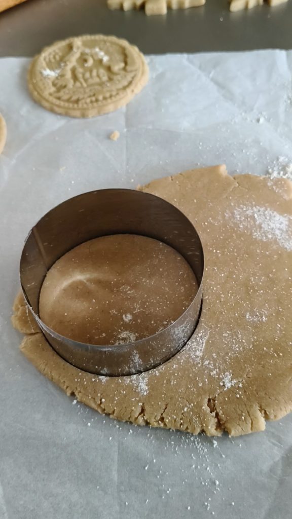 • Después de preparar y dejar reposar la masa quebrada navideña, extenderla a un grosor de 3 mm sobre la superficie ligeramente enharinada (a veces la extiendo sobre el papel de horno donde hice reposar la masa, así no tengo que poner harina debajo, solo ligeramente en la superficie) y cortar los discos para formar las galletas.
