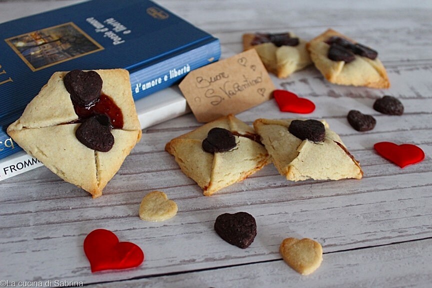 Pequeños y deliciosos rectángulos de masa quebrada, doblados como un sobre de carta, rellenos de mermelada o crema para untar de la que salen muchos corazoncitos.