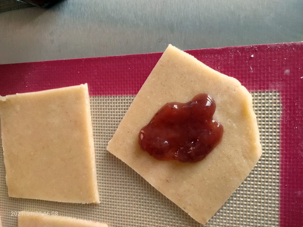 • – Untar en cada cuadrado una cucharadita de mermelada.