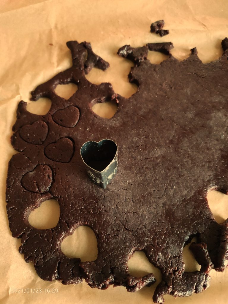 • – De la masa quebrada de cacao, (de la cual hice media dosis, quité 25g de harina y agregué 25g de cacao) hecha también el día anterior, cortar muchos corazoncitos para pegar en varios puntos de los sobres, presionándolos ligeramente.
