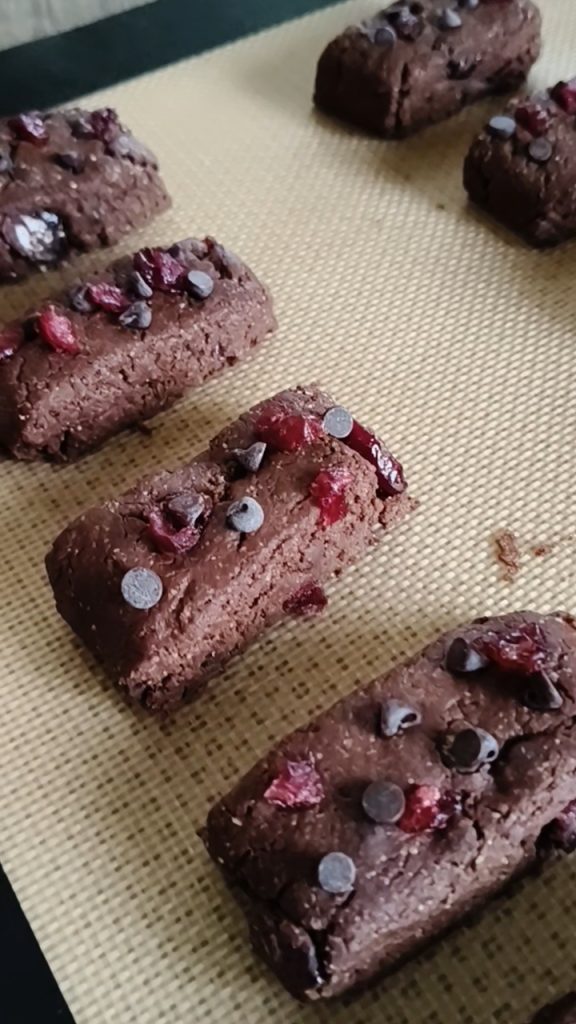 La masa está a base de yogur natural, harina de avena y cacao puro en polvo, con la adición de gotas de chocolate negro y arándanos deshidratados que aportan una dulzura natural y un agradable contraste.