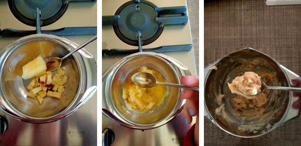 Calentar la mantequilla con la miel y añadir el chocolate blanco, la vainilla y la cáscara de naranja. Fuera del fuego, añadir una cucharadita de ron. Guardar en la nevera y usar frío para la segunda masa después de mezclarlo ligeramente con un tenedor.
