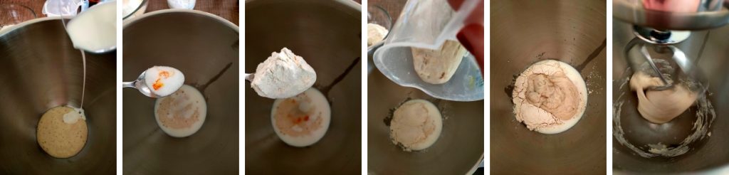 – Ponemos en el bol de la amasadora la levadura natural con la leche, añadimos una cucharada de azúcar y la harina necesaria para obtener una masa que se adhiera a la hoja; luego añadimos el prefermento y la clara de huevo y dejamos que se amase.