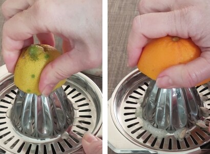 – Exprimir medio limón y media naranja recogiendo los jugos en el exprimidor.