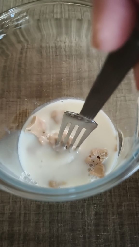 Colocamos en un recipiente o vaso la levadura desmenuzada y la leche tibia con 1 cucharadita de azúcar y 2 cucharadas de harina (todos los ingredientes tomados del total).