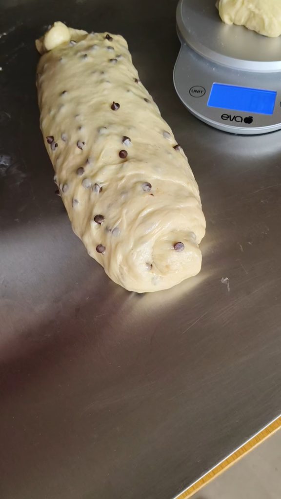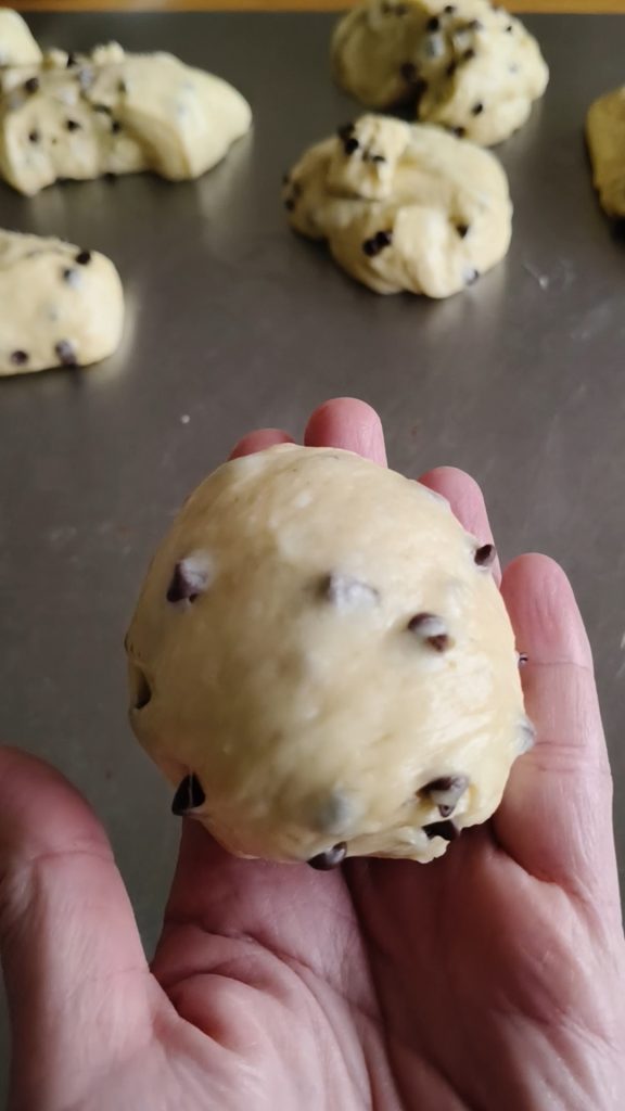 Verter las gotas de chocolate frías de nevera y dar algunas vueltas a baja velocidad con el gancho para que se integren. Voltear la masa y, si es necesario, dar algunas vueltas más.