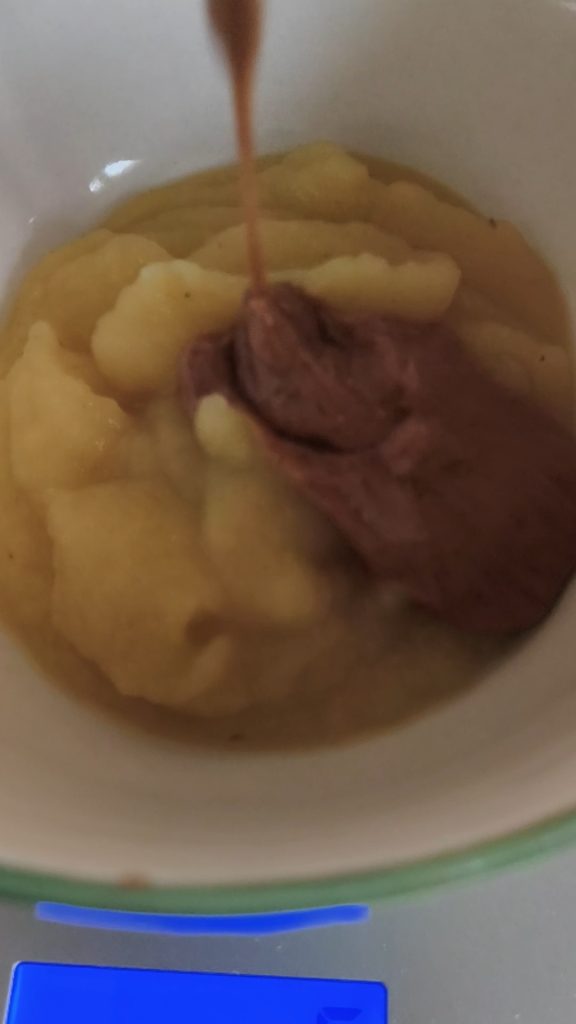 En un bol pequeño o vaso, vierte la compota de manzana, la crema de almendras, la canela y mezcla.