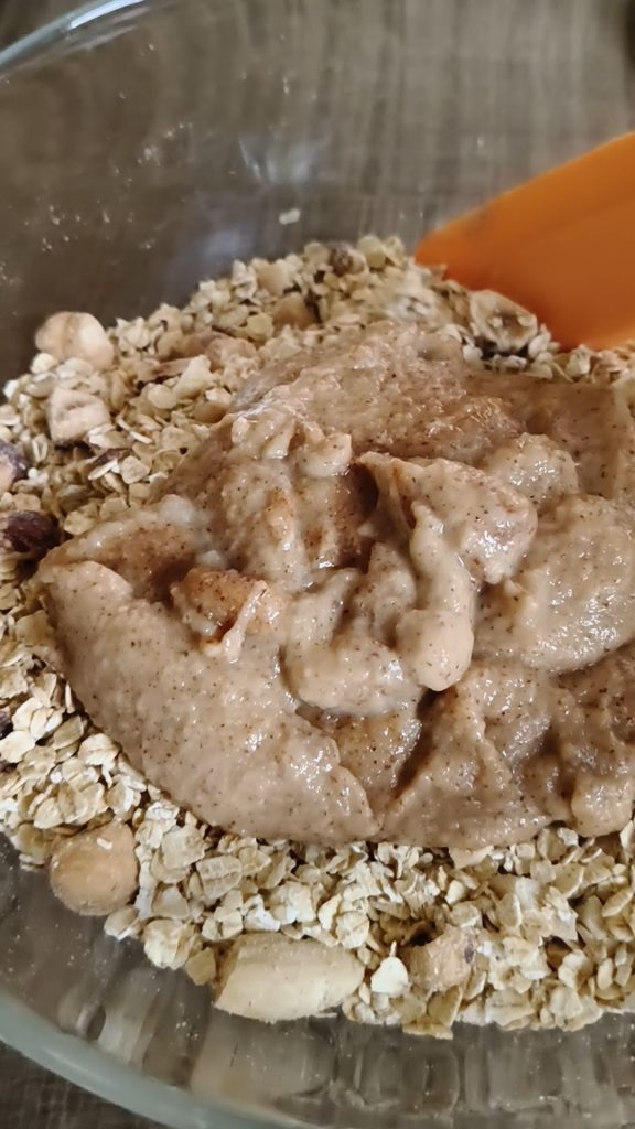 Se prepara con poquísimos ingredientes, sin azúcar, miel o jarabes: solo avena, frutos secos y la suavidad de la compota de manzana que une todo a la perfección.