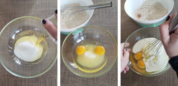 – Poner en el cuenco el azúcar y luego verter el aceite, los huevos y el yogur; mezclar con el batidor de mano o con el tenedor.