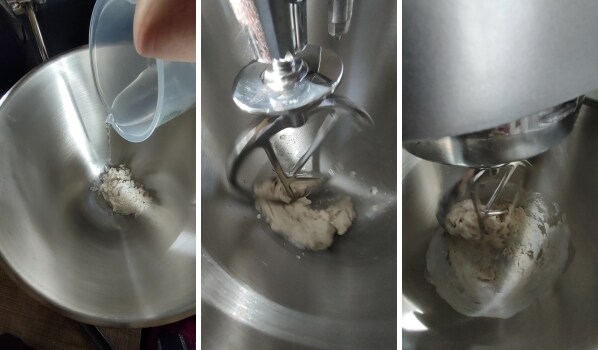 – Verter en el bol de la amasadora el fermento y el agua; amasar brevemente y luego añadir la mitad de la harina.