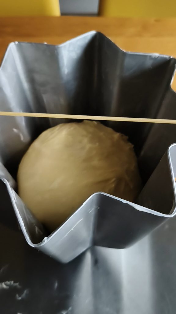 • Para controlar la fermentación, poner un espagueti en el borde del molde y cubrir con film o con un gorro de ducha desechable (obviamente no usado). La fermentación se puede hacer en el horno con la luz apagada teniendo cuidado de que no supere los 25/26°C (no teniendo levadura natural es mejor no superar estas temperaturas). El pandoro está listo para hornear cuando la masa llega al espagueti.