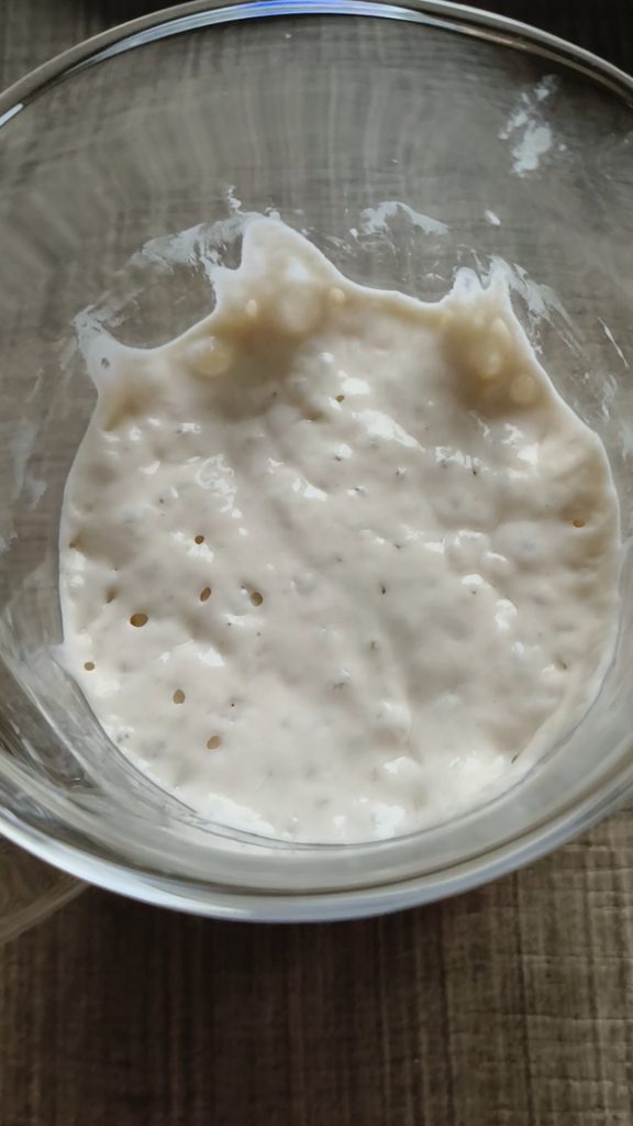 • Mezclar en un vaso graduado todos los ingredientes con un tenedor, brevemente. Cubrir y dejar a t.a. durante unas 12 horas. El poolish está listo cuando, después de llegar al máximo de su fermentación, comienza a colapsar en el centro con pequeñas burbujas rotas (ver foto).