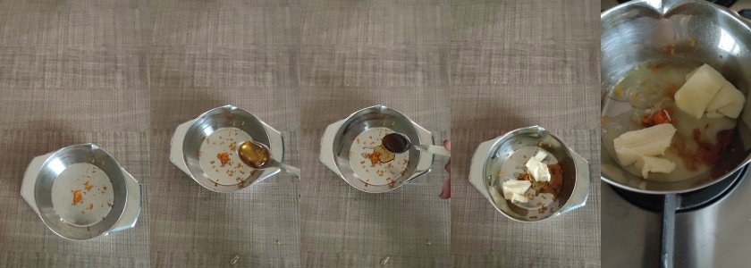 – Calentamos en un cazo la mantequilla con la miel, la ralladura de mandarina y la vainilla, tan pronto como la mantequilla se derrita, apagamos y cubrimos.