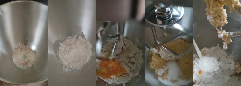 – Verter en el bol de la batidora de pie, la levadura de cerveza desmenuzada y un poco de leche; dejar disolver la levadura de cerveza y verter unas cucharadas de harina y comenzar a amasar.