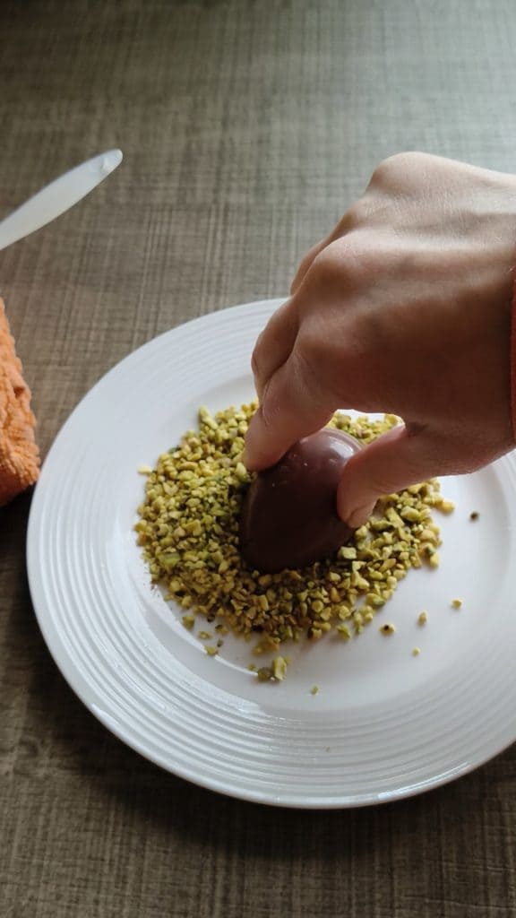 Hacer que el granillo de pistacho se adhiera a los bordes de los huevos ejerciendo una ligerísima presión.