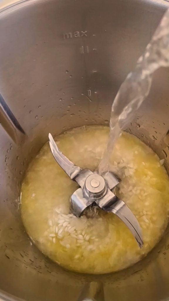 Añadid el arroz, tostádlo a 100°C durante 1 min./giro inverso. Desglasad con vino blanco 1 min./giro inverso 100°C vel/soft sin cubilete.