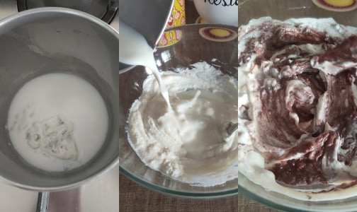 – Calentar la leche en el fuego, apagar y añadir la gelatina remojada y escurrida; remover con un tenedor para disolverla bien y luego verterla sobre la crema de ricotta incorporándola bien con una espátula.