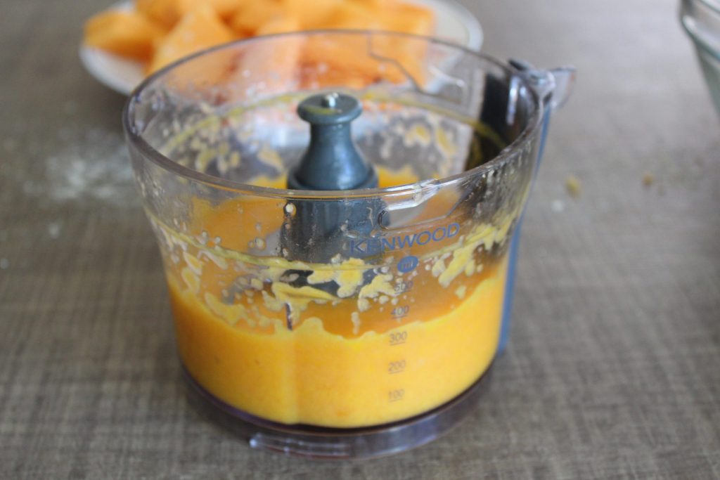 • – Triturar la calabaza cortada en cubos con el aceite y dos cucharadas de la mezcla.