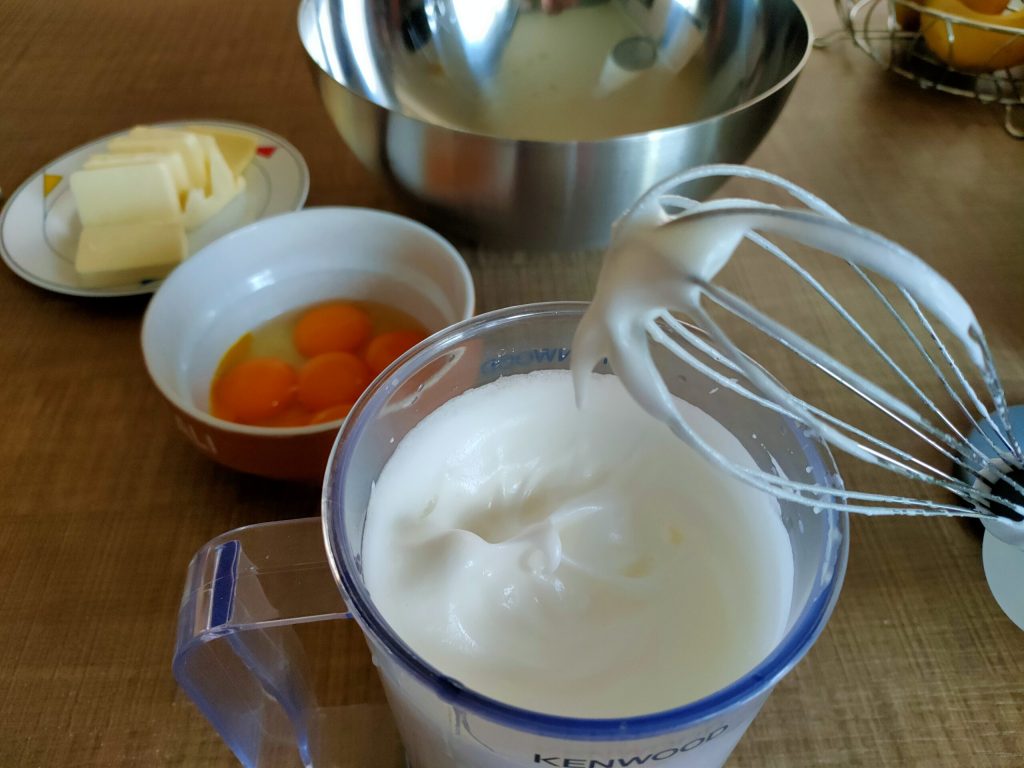 – Llevar a ebullición 110 g de nata y verterla sobre el chocolate con leche colocado en el bol; mezclar bien y luego añadir los 270 g de nata semimontada, reservada previamente. Cubrir con film de contacto y pasar al frigorífico.