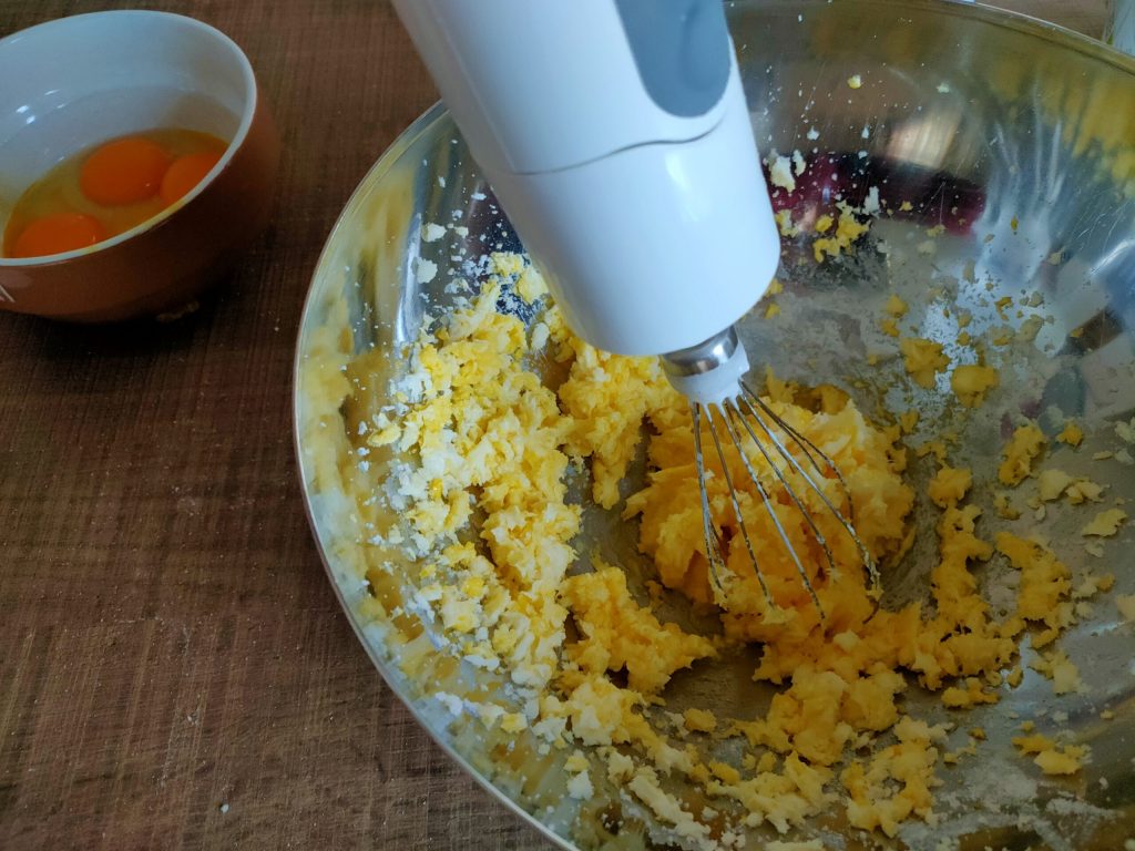 En un bol, mezclar el azúcar con la mantequilla blanda, luego añadir las yemas y mezclar con las varillas.