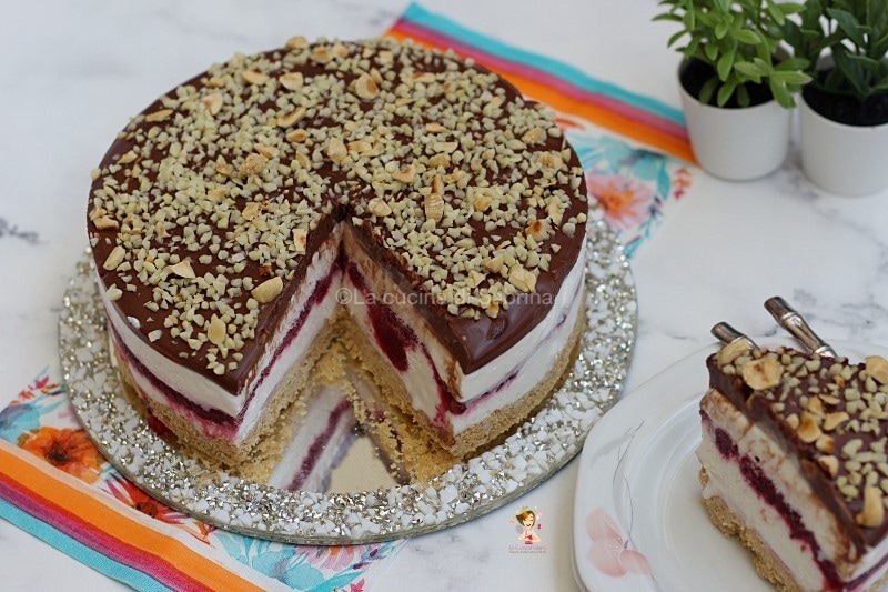 Que tiene dentro la mermelada de cerezas o guindas, así que incluso quien no ama particularmente las en almíbar o no tiene ganas de triturarlas no tendrá excusas, y luego la golosa cobertura de chocolate cubierta con granillo de avellanas.