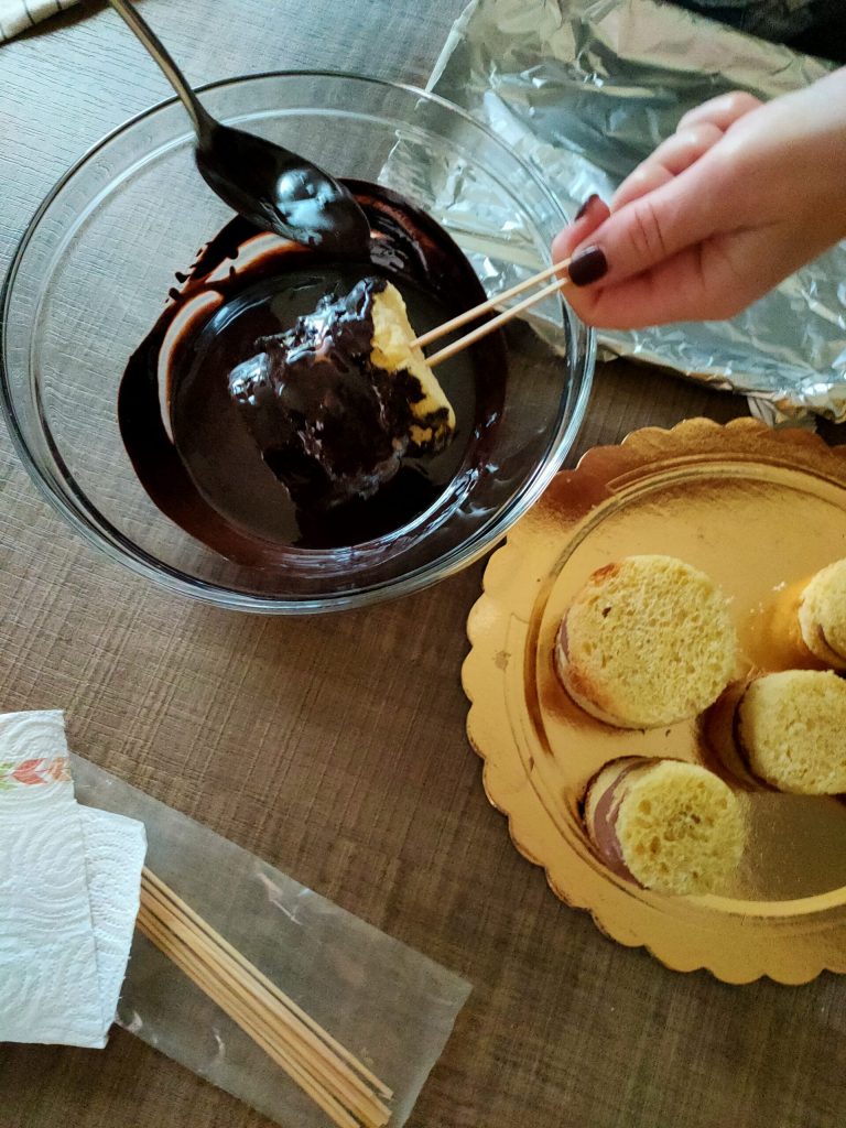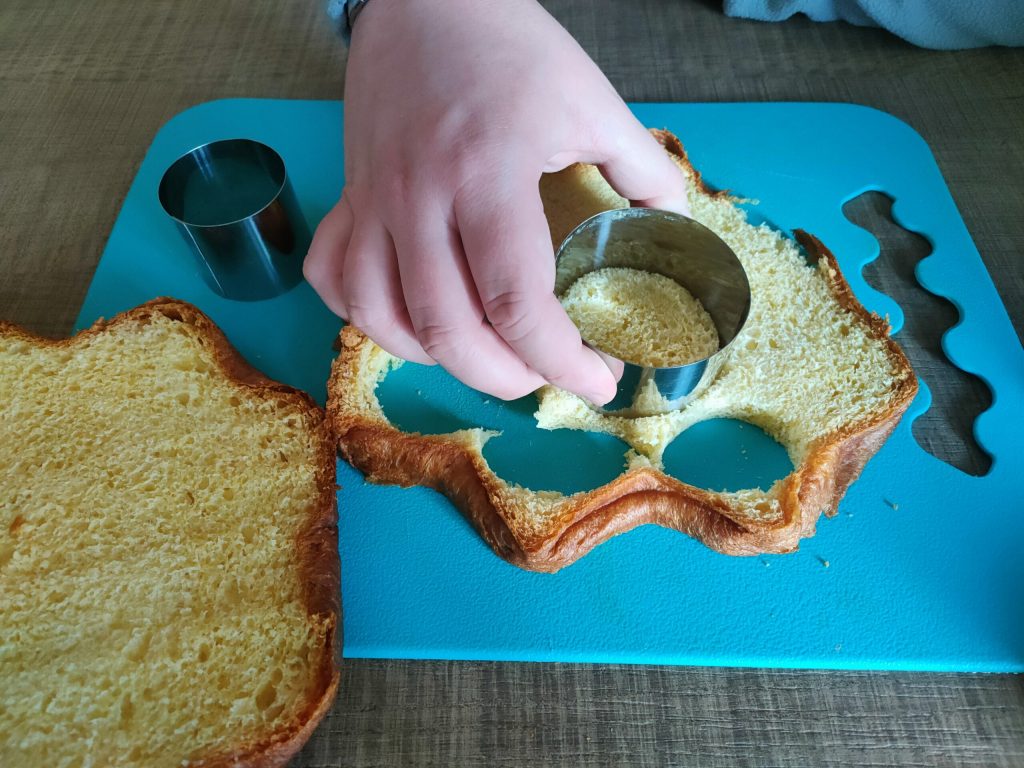 Cortar del pandoro 3 rebanadas de aproximadamente un centímetro y luego cortar los discos con cortadores de galletas de diferentes diámetros para formar torres. Derretir los 2 tipos de chocolate al baño maría o en el microondas.