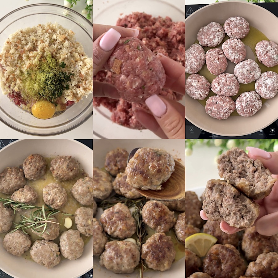 Cuando estén bien doradas, añade el zumo de limón, una ramita de romero y un diente de ajo (puedes usar los que utilizaste antes para el sofrito) y deja cocinar las albóndigas al limón, con tapa, durante 5 minutos a fuego medio-bajo, dales la vuelta y sigue cocinando otros 5 minutos.