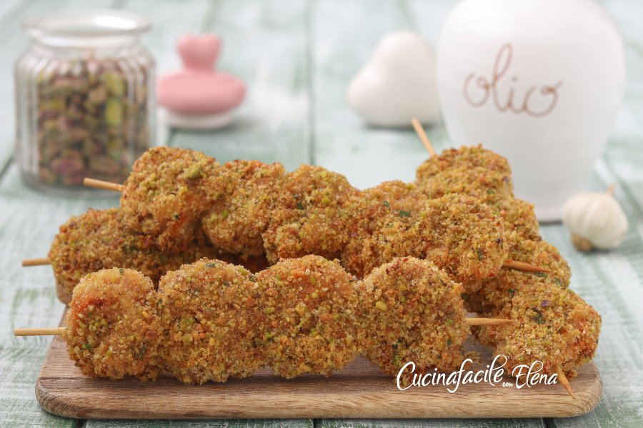 Las brochetas de gambas al pistacho gratinadas al horno son un segundo plato de pescado fácil, rápido y delicioso. Tenía unas gambas grandes y pensé en preparar una buena receta perfecta para las fiestas de Navidad, así que las pelé, las empané con un empanado sabroso con costra de pistachos triturados y cocinado en el horno. ¡Pero qué ricas estaban! Las brochetas de gambas al pistacho son tiernas por dentro y crujientes por fuera, puedes hacerlas tanto con gambas frescas como congeladas, son ideales como segundo plato de mar para la cena de Nochebuena o para el almuerzo de Año Nuevo, pero van genial también como entrante, acompañadas quizás de un poco de salsa cocktail, ¡desaparecerán enseguida!