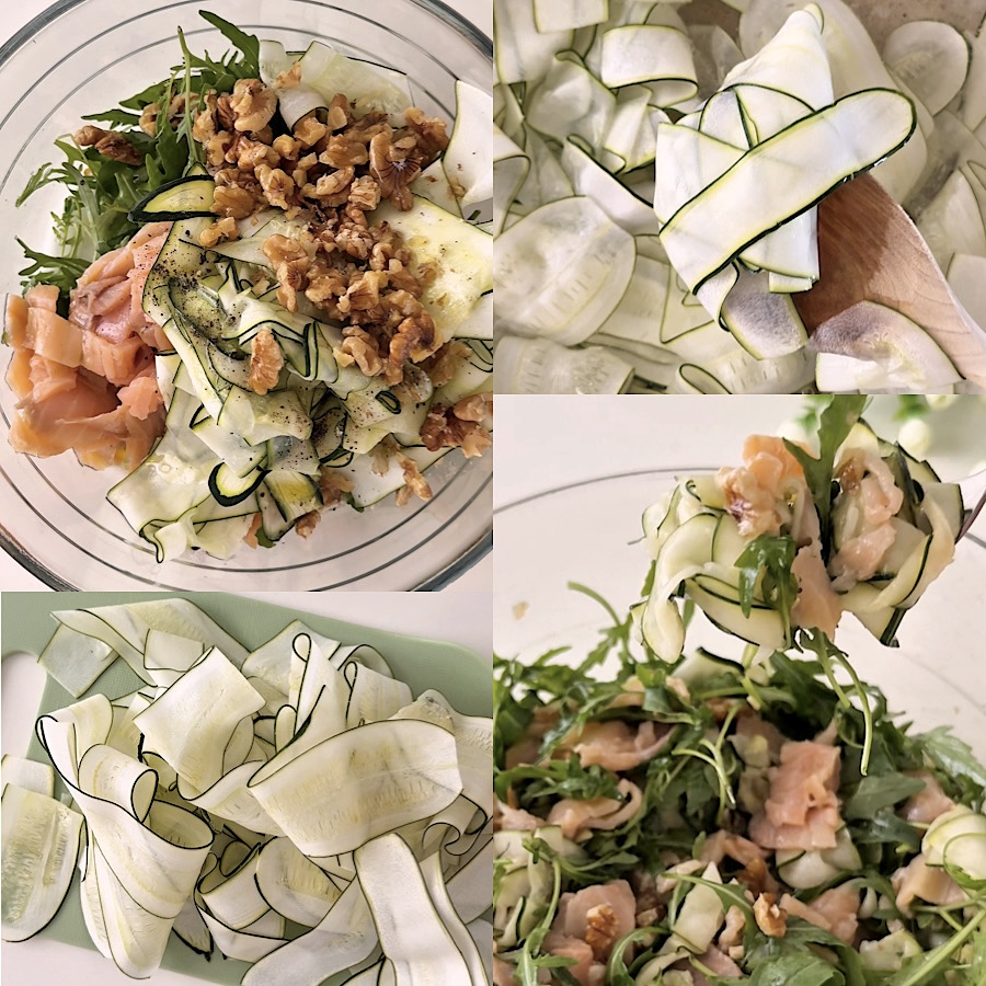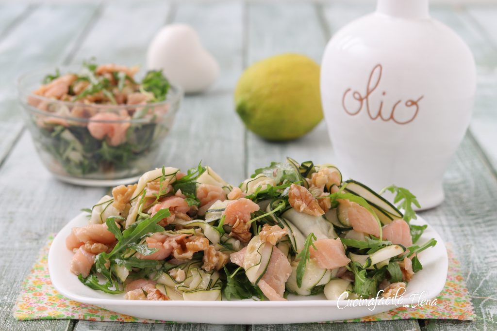 La ensalada de calabacines y salmón es una ensalada veraniega fresca, rapidísima, nutritiva y súper sabrosa. No se puede definir sin cocción porque en realidad los calabacines deben escaldarse un poco, pero solo se necesitan dos minutos para este paso, por lo que la prepararás de todas formas en muy poco tiempo. Esta ensalada de calabacines y salmón con rúcula y nueces se ha convertido en una de mis favoritas de este verano, es perfecta como entrante, segundo o plato único, sencilla, fresca y deliciosa, perfecta también para llevar a la playa, al parque, a la oficina o donde quieras!