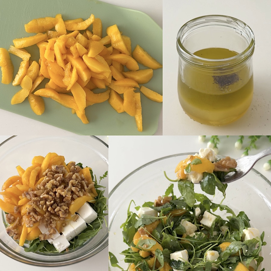 La ensalada de melocotones y feta se conserva en la nevera por un día. Te recomiendo prepararla y disfrutarla en poco tiempo, para evitar que la rúcula se «marchite». Si quieres llevarla contigo o conservarla por más tiempo, te aconsejo añadir el aderezo al momento de servir, mantenlo siempre en el tarro de vidrio, que además es a prueba de fugas.