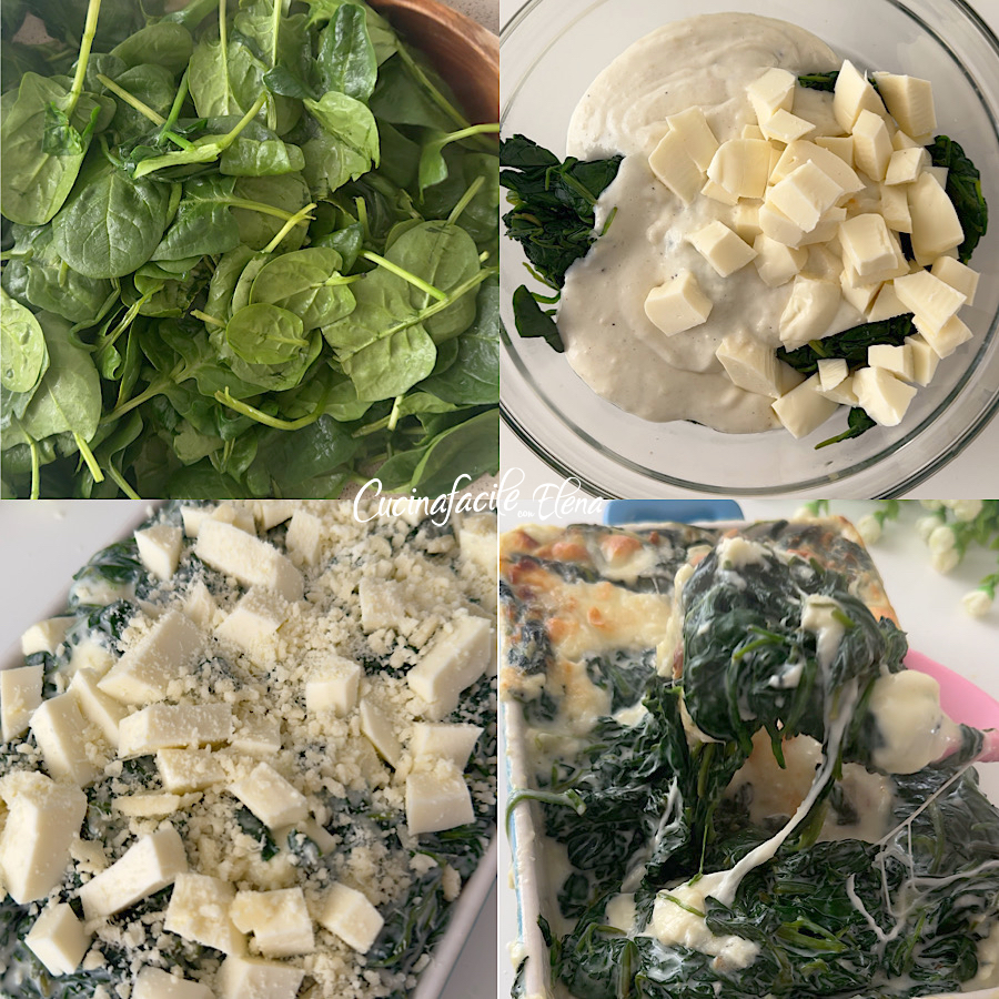 • Ponga las espinacas en un bol, salelas, añada la bechamel, la scamorza en trocitos y mezcle todo. Transfiera las espinacas a una fuente para horno, nivele bien, añada por encima un poco de scamorza en trocitos, queso parmesano rallado y hornee las espinacas gratinadas en el horno precalentado a 180 grados durante 15 minutos, los quesos deben fundirse completamente y debe formarse una costra ligeramente dorada.