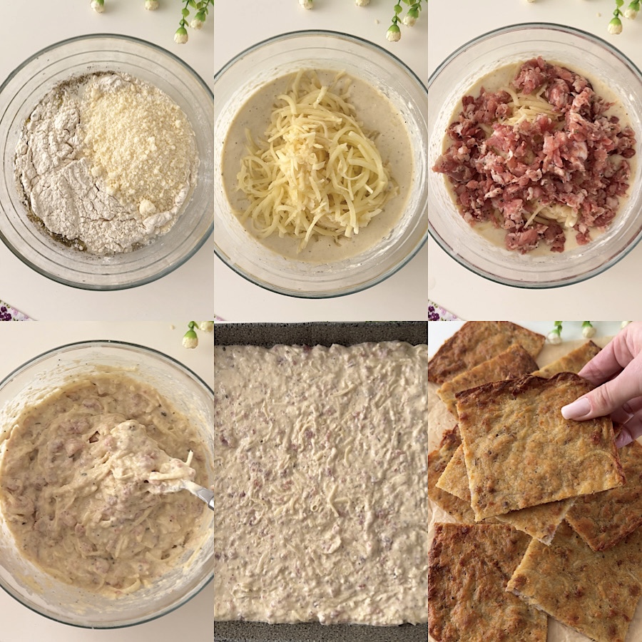 La focaccia de patatas y salchicha se conserva a temperatura ambiente durante unas horas o en la nevera durante un par de días. Si lo prefieres, también puedes omitir el queso rallado.