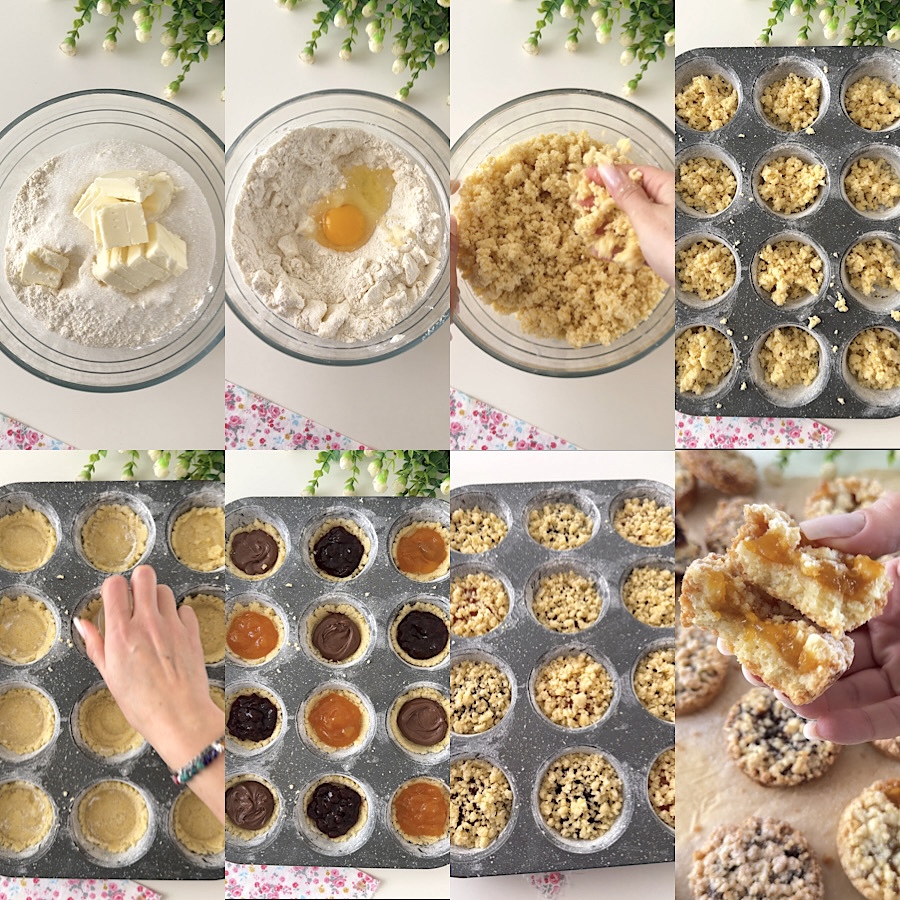 Las galletas desmenuzadas son unos dulces fáciles, rápidos y realmente deliciosos. Quería preparar unas galletitas para el desayuno, pregunté en casa cómo las querían y eligieron Nutella y mermelada. Así que pensé en hacer unas mini desmenuzadas en el molde para muffins que literalmente volaron. ¡No duraron ni dos días! Las galletas desmenuzadas las llamé así porque se preparan justamente «desmenuzando» la masa quebrada, no hace falta ser demasiado preciso y les puedes poner lo que quieras, buenísimas también con crema de pistacho o crema pastelera. Estoy segura de que estas galletas desmenuzadas conquistarán a todos, son perfectas tanto para el desayuno, como para la merienda o como postre, ¡fantásticas también para mojar en leche o capuchino!