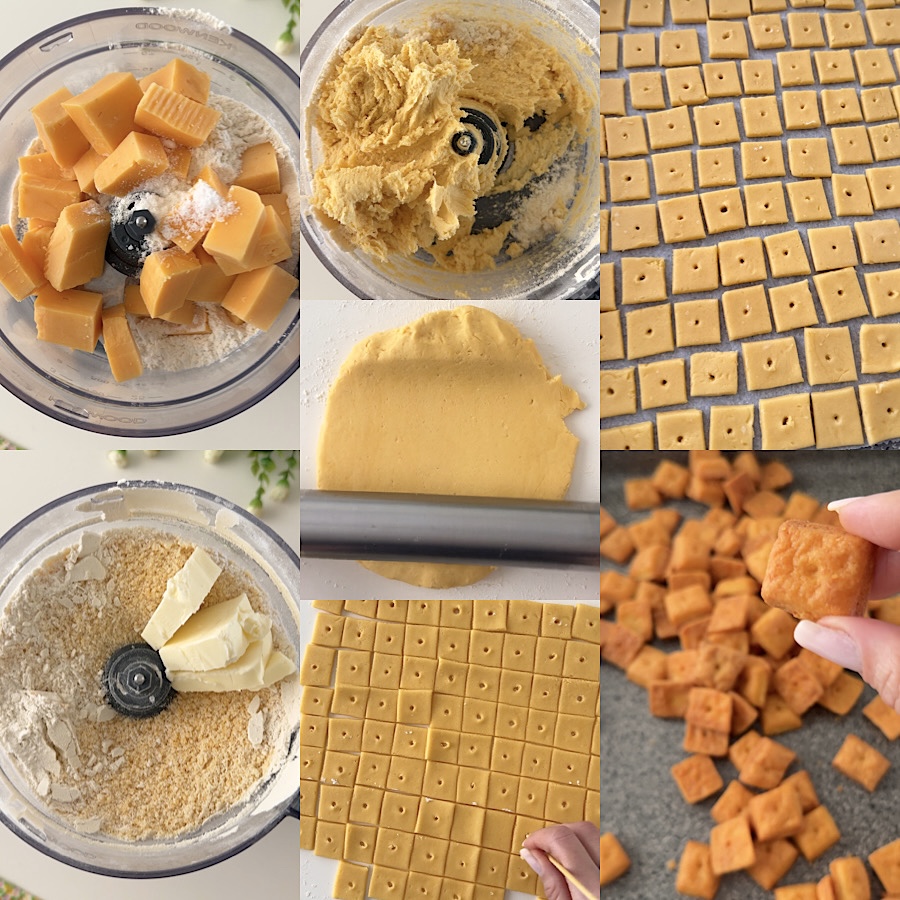 • Las galletitas de queso son súper fáciles y rapidísimas de preparar, lo primero que hay que hacer es poner en la picadora la harina, el cheddar cortado en trocitos, la sal y batir hasta obtener una mezcla homogénea. Añadid la mantequilla fría en trocitos y batid nuevamente.