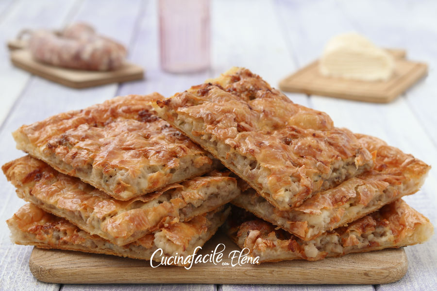 El hojaldre de salchicha y stracchino es una tarta salada rápida y buenísima! Tenía un poco de salchicha en el congelador, stracchino y hojaldre a punto de caducar y pensé en preparar este delicioso rústico salado, una variante de las clásicas bruschettas con stracchino y salchichas. ¡Desapareció rápidamente! El hojaldre de salchicha y stracchino se prepara en 10 minutos y va directo al horno, es crujiente, sabroso y apetitoso, perfecto como segundo plato o como aperitivo, ideal para un picoteo, blando por dentro y crujiente por fuera, buenísimo tanto caliente como frío, ¡simplemente irresistible!