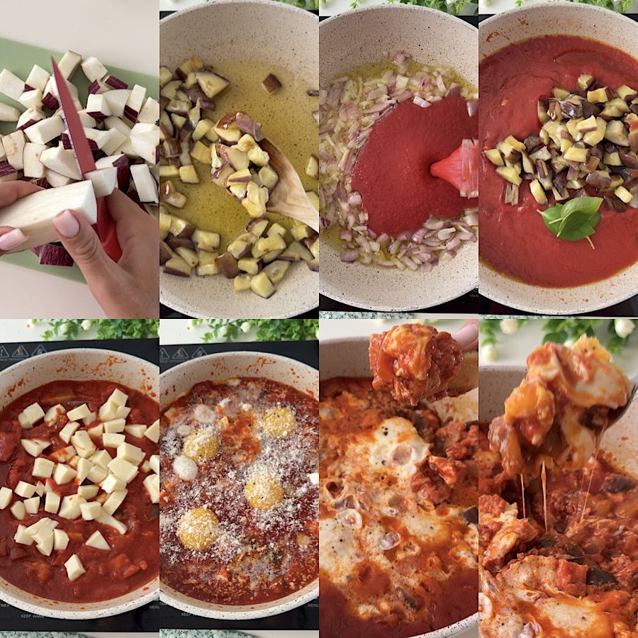 • Después del tiempo, añadid la scamorza en trocitos, removed rápidamente y agregad los huevos, condimentadlos con sal, pimienta negra, queso parmesano rallado y dejad cocinar los huevos a la parmesana de berenjenas, con la tapa durante 6-7 minutos si queréis que la yema quede blanda, 8-9 minutos si la preferís más dura.