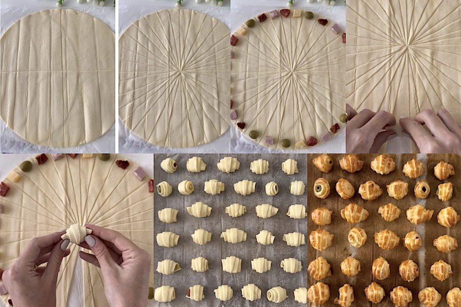 Los mini croissants salados de hojaldre son unos croissants rústicos súper rápidos y súper sabrosos que se preparan en poquísimos minutos, con pocos y simples ingredientes. Estoy pensando en recetas navideñas simples y rapidísimas y, aunque no tienen una verdadera forma navideña, estos croissants rellenos son perfectos para preparar como aperitivo para la Nochebuena o el almuerzo de Navidad o cena o días de Año Nuevo, pero también para un aperitivo, una fiesta o un buffet. ¡Desaparecerán en un santiamén! Los mini croissants salados se hacen en menos de 10 minutos y pueden ser rellenados con el relleno que prefieras, yo he usado salami picante, mortadela, parmesano en trocitos, aceitunas verdes y tomates secos, pero puedes usar lo que quieras, salmón ahumado, atún, salchichas, quesos o verduras, con solo una lámina de hojaldre prepararás nada menos que 32 piezas de mini croissants salados, ¡pero abunda porque nunca serán suficientes!