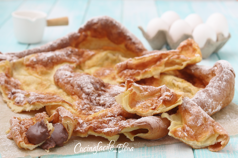 El pancake al horno es una receta realmente espectacular. Probé esta receta por casualidad, estaba charlando con una amiga y surgió el nombre de un postre, el German o Dutch baby pancake (receta americana, no alemana a pesar del nombre), también llamado pancake al horno. Me despertó curiosidad y me documenté sobre esta receta, tenía unas ganas locas de probarlo. Me quedé sin palabras, primero cuando, en la cocción, se hinchaba muchísimo y, posteriormente, cuando lo probé. ¡Un espectáculo! El pancake al horno es una mezcla entre pancake, profiterol y crepes, es muy suave, pero también ligeramente hojaldrado y crujiente, en resumen, una maravilla que hay que probar. Con Nutella, fruta fresca o seca, mermelada, crema pastelera o untuosa, mantequilla de cacahuete pero también solo, con un poco de azúcar glas, el pancake al horno es realmente excepcional, la masa es sin levadura, sin azúcar, sin aceite y sin mantequilla se prepara en 2 minutos y directo al horno caliente, en la cocción aumentará muchísimo de volumen, convirtiéndose en una nube, pruébalo, se convertirá en tu desayuno favorito, ya es un básico de mi domingo 😀