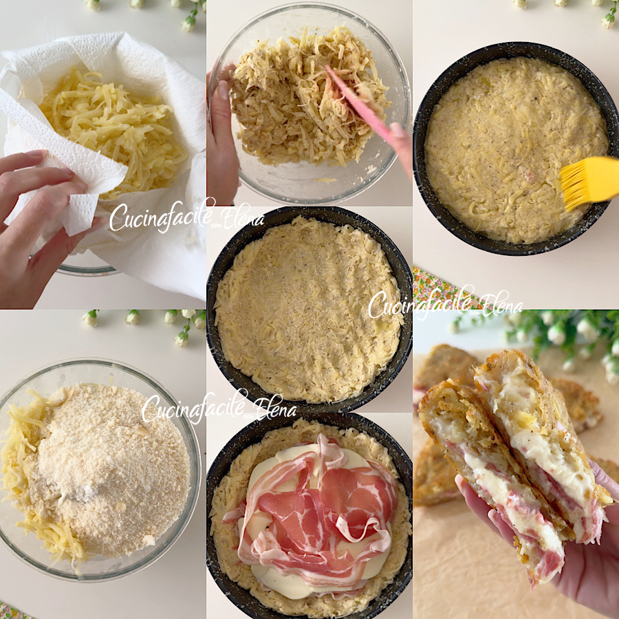 La pizza de patatas ralladas es muy sencilla y rápida de preparar, primero pela las patatas y rállalas con un rallador de agujeros grandes, exprímelas para eliminar el exceso de líquido (puedes usar un papel de cocina bastante resistente o un paño de algodón).