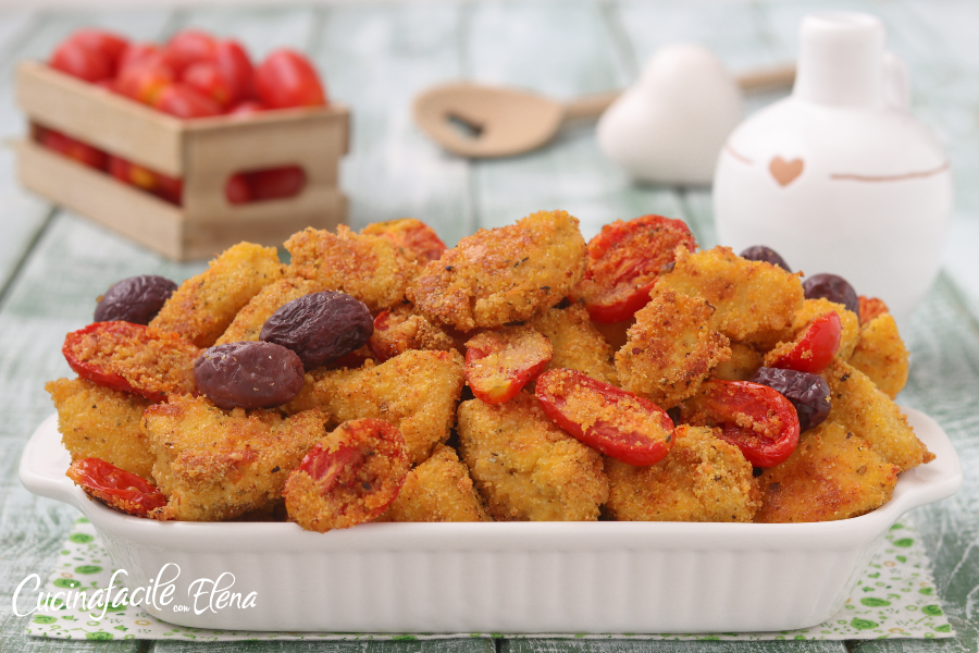 El pollo con tomate cherry y aceitunas gratinado al horno es una receta rápida y muy sabrosa. Cada vez que cocino pollo, me gusta prepararlo de manera diferente, pero estos bocados son tan buenos que los hago a menudo. El pollo con tomate cherry y aceitunas se prepara en pocos minutos sin huevos, es doradito y crujiente por fuera y tierno por dentro, delicioso y sabroso, empanado con harina de maíz para hacerlo aún más rico, con guarnición de tomate cherry y aceitunas negras, ¡un segundo de categoría!