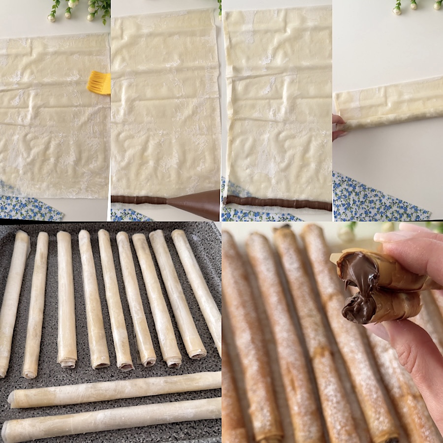 • Tomad una hoja de pasta filo, pincelad la superficie con un poco de mantequilla derretida (no necesariamente toda y de manera demasiado homogénea) y rellenad la base con un poco de Nutella, formad una especie de cilindro; para ser más precisa, yo la puse en una manga pastelera sin boquilla (aunque también va bien con boquilla redonda), pero también podéis usar una jeringa de cocina, o, en el peor de los casos, dos cucharaditas.
