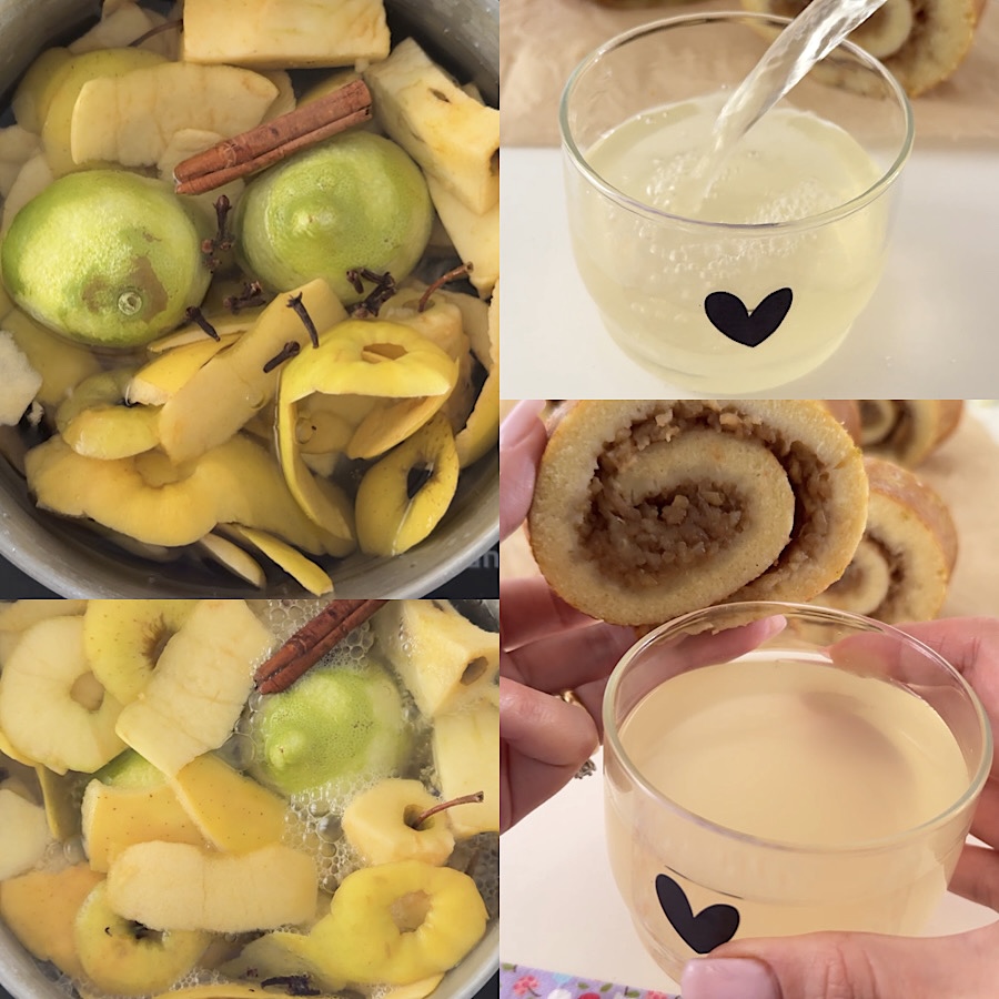• Dejad reposar el rollo por unos minutos, justo el tiempo de que tome forma. Mientras tanto, preparemos nuestra deliciosa infusión, con los restos de las manzanas: poned todos los restos de las manzanas en un cazo (tanto cáscaras como corazones), añadid el limón del que habéis rallado la cáscara, exprimiendo el jugo antes, una rama de canela, algunos clavos de olor y llevad a ebullición. Continuad la cocción durante 5 minutos, apagad el fuego, dejadla reposar, si queréis, otros 5 minutos, con la tapa puesta y filtradla.