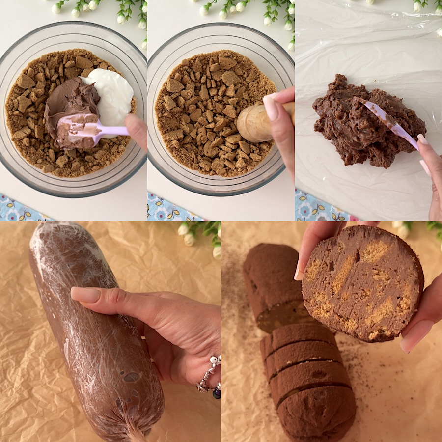 El salchichón de chocolate con yogur se conserva en la nevera por 3/4 días. Podéis usar el yogur que prefiráis, tanto blanco como del sabor que prefiráis (vainilla, café, coco). Yo elegí el sin azúcar, ya que usé también chocolate con leche y blanco, si usáis solo el negro, dado que no hay azúcares añadidos, podéis, si queréis, usar un yogur dulce para equilibrar.