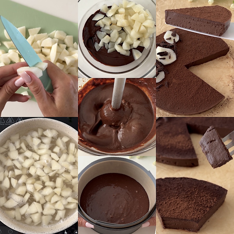 La tarta choco-pera es un dulce rápido y muy ingenioso que se prepara en poquísimos minutos sin horno y con solo 2 ingredientes, peras y chocolate negro. Con este calor apetece comer dulces frescos y ligeros (pero sigue siendo un dulce perfecto para todo el año) y, con las peras que hemos recogido en el campo, he preparado esta tarta deliciosa y súper chocolatosa. ¡La fruta está, pero no se ve! La tarta choco-pera es aromática y cremosa, perfecta para el postre, la merienda o como snack, ¡es realmente especial!