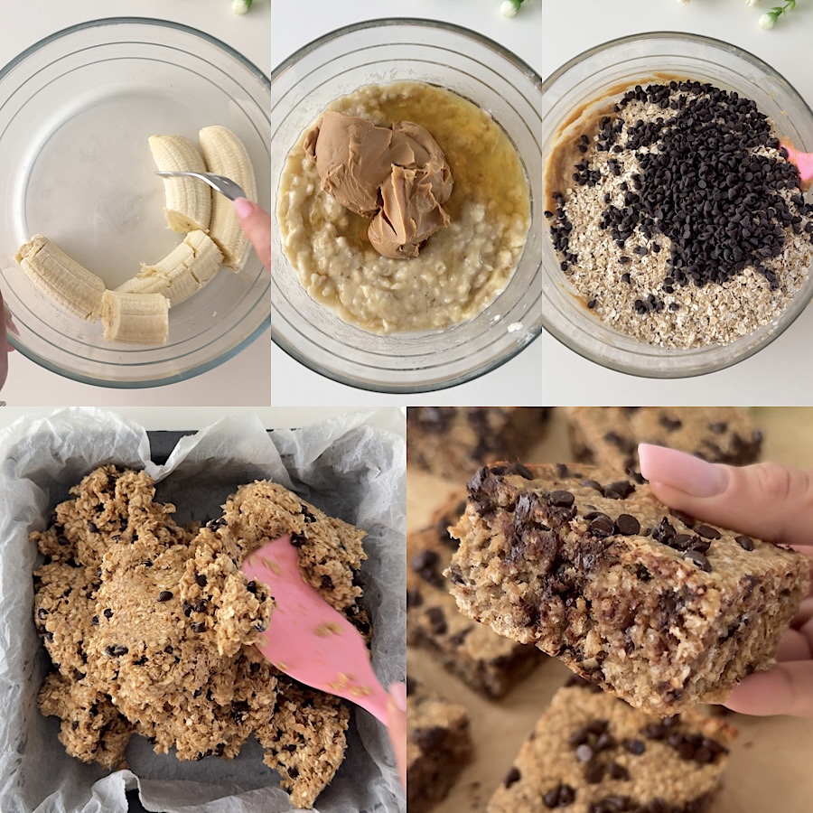 • Añade la miel, la mantequilla de cacahuete y mezcla bien, agrega después los copos de avena, las pepitas de chocolate negro y mezcla bien todos los ingredientes.