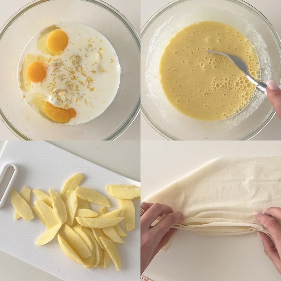 Pelar la manzana, cortarla en rodajas finas y condimentar con el jugo de medio limón. Tomad una hoja de pasta filo y arrugadla sobre sí misma, repetid esta operación con todas las demás hojas.