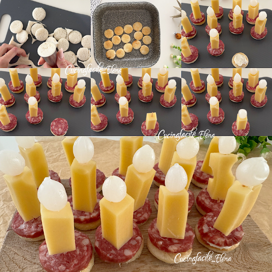 Tomad un círculo de pan, untad un poco de queso y poned una rodaja de salami encima. Pinchad un trozo de emmental con un palillo (dejando que se deslice en el centro, por encima y por debajo del queso debe verse un poco de palillo) y colocadlo sobre el salami, realizad la llama de la vela, colocando una cebolleta en vinagre sobre el queso.
