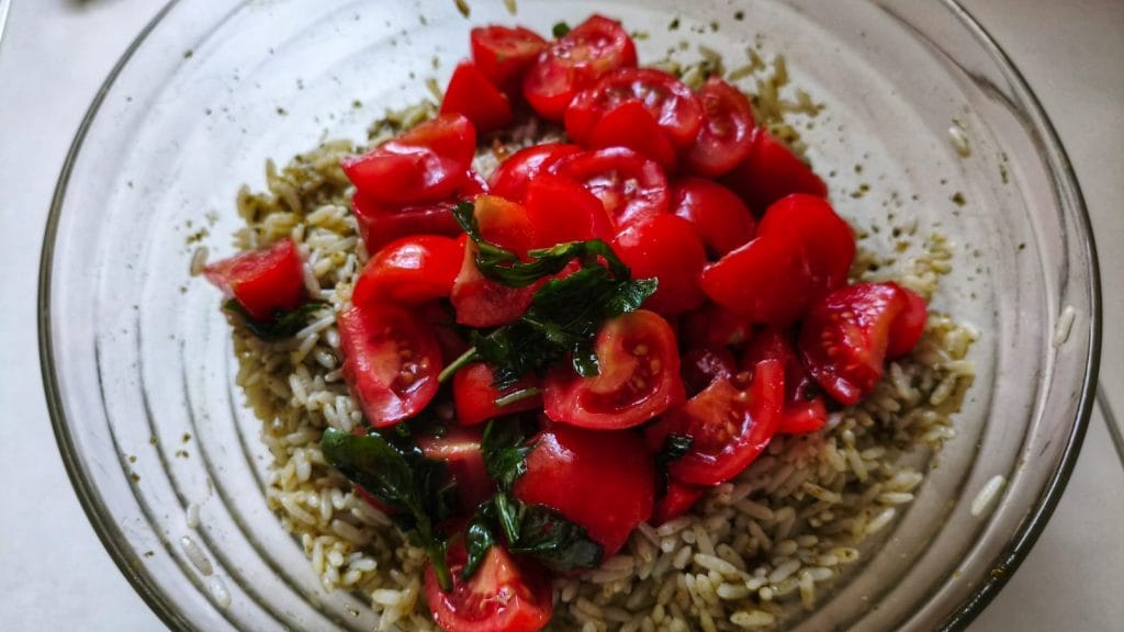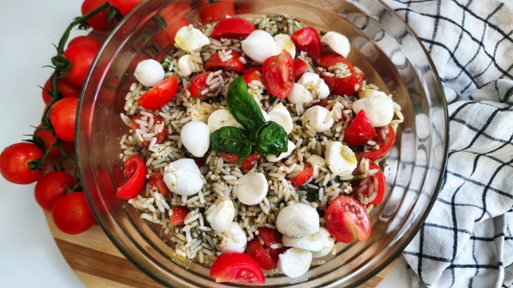 Lo bueno es que se necesitan realmente pocos ingredientes: arroz basmati o arroz para ensaladas, tu pesto preferido, tomatitos frescos cortados por la mitad y bolitas de mozzarella que se derriten casi en la boca. Solo hay que cocer el arroz, dejarlo enfriar, añadir todo y mezclar.